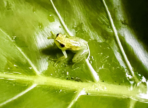 That world often reveals itself in moments of stillness. A small green tree frog perched motionless on a broad philodendron leaf, its colour so perfectly matched that it appears almost grown from the plant itself. The frog is not hiding, it simply belongs so precisely to its surroundings that it disappears into them. In St Lucia, scenes like this are surprisingly common — but only for those who pause long enough to notice.